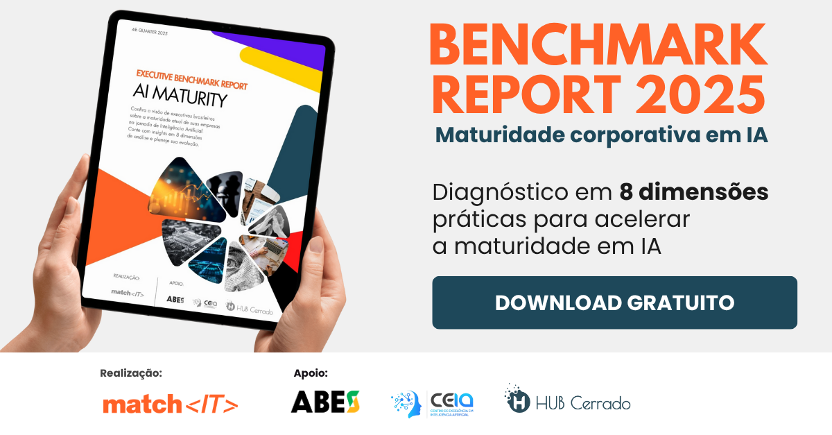 O estudo, conduzido pela Match<IT> com apoio da ABES, CEIA e Hub Cerrado, analisou a maturidade em IA de empresas brasileiras — de diversos setores e portes — e revela um panorama completo sobre os principais gargalos, avanços e oportunidades de quem está tentando transformar IA em vantagem competitiva.