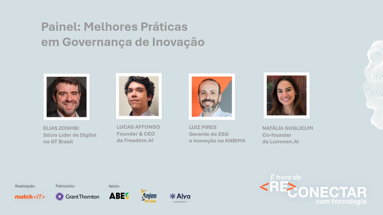 No atual cenário de transformação tecnológica, falar de governança de inovação exige cautela e estratégia. Em painel realizado no último Reconectar com Tecnologia, contamos a participação de Luiz Pires, Gerente de Inovação na ANBIMA, Elias Zoghbi, Sócio Líder de Digital na Grant Thornton Brasil, Lucas Affonso, CEO da Freedom AI e Natália Guglielmi, Co-founder da Lummen AI. O debate girou em torno do tema: Melhores Práticas em Governança da Inovação.